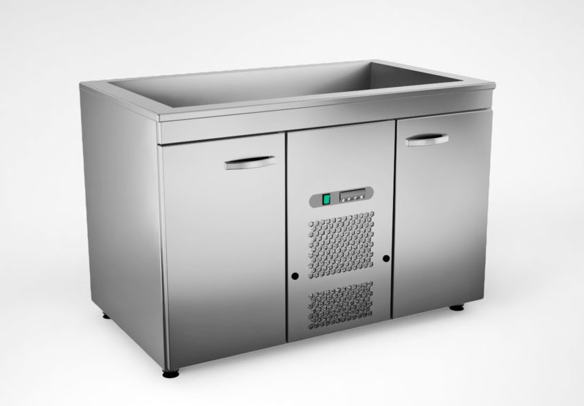 Kylmäallas joka sopii myös juomien säilyttämiseen viileässä, allas on GN-mitoissa 3x GN 1/1-150 Kaapissa on 8 paria johteita GN-astioille GN 1/1-50 tai yksi hylly säädettävällä korkeudella, ilmoitettava tilausta tehtäessä.